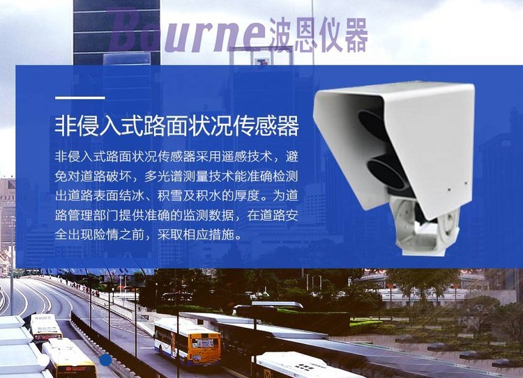 由北京波恩儀器公司研制的BN-LMRSS11是一款非接觸式路面狀態(tài)檢測器,它采用遙感技術,避免了對道路的破壞,從而不會因為安裝道路氣象站引起的對交通的干擾。多光譜測量技術使得能準確檢測道出道路表面結冰、積雪和積水的厚度。在埋入式路面?zhèn)鞲衅鞑槐慊虿荒馨惭b的路面條件下,波恩儀器的該款路面狀況檢測器是理想的選擇。遙感安裝,意味著不需要封閉道路、不需要切割路面,安裝工作既安全又方便。維護量少,是道路氣象系統(tǒng)組成中一項理想選擇。它既可以安裝在現(xiàn)有的氣象站上,也可以安裝在路面視野無遮擋的其他建筑物上。